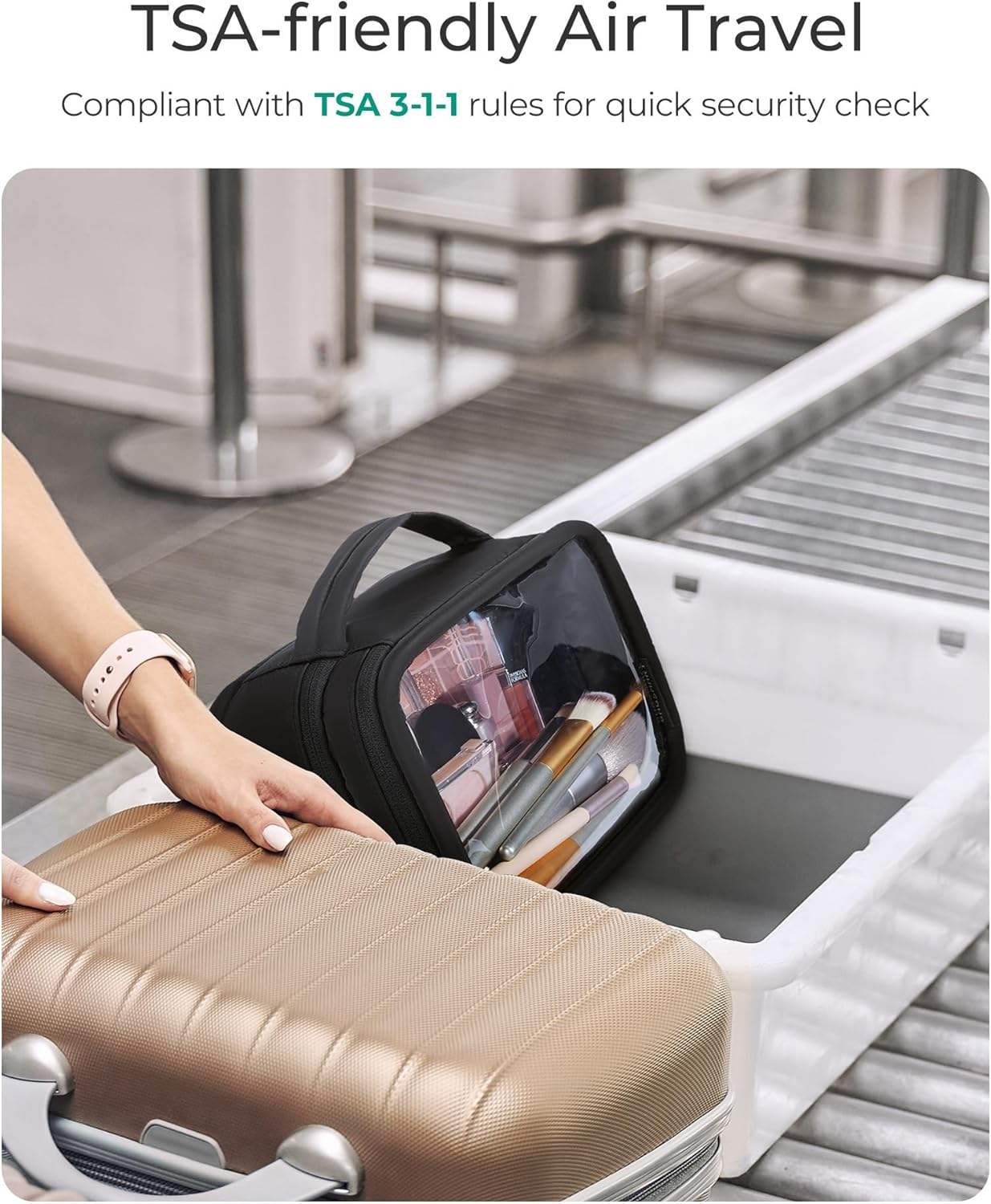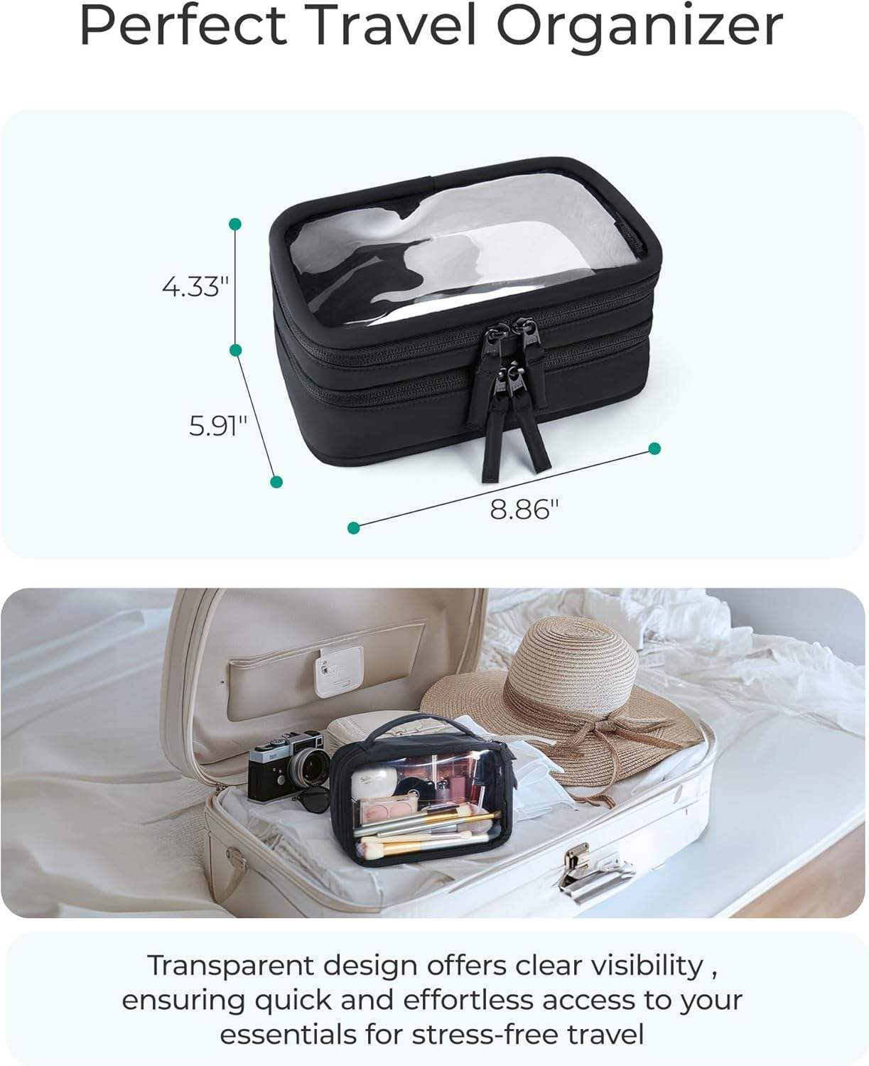 • TSA Approved: Compliant with Liquids Rule: This double layer clear travel toiletry bag measures 8.86 x 5.91 x 4.33 inches, making it compliant with the TSA’s 3-1-1 liquid rule. It holds up to 1 quart of liquids, allowing you to pass through airport security with ease, saving time and reducing stress.